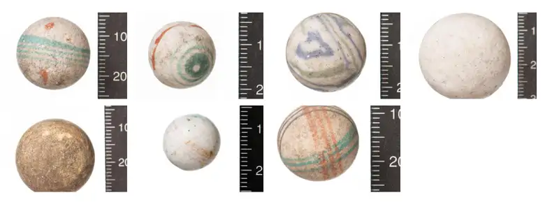 Al pie de la cayuela, los arqueólogos atoparon tamién una colección de ‘alleys’, pequenos banzones de cerámica de colores qu’asonsañaben l’alabastru. Estes bolines, comunes ente los neños del sieglu XIX, fueron topaes nel interior d’un drenaxe de lladriyu cubiertu, lo que suxure que se-yos cayeron (o quiciabes les escondieron) mientres xuna partida a la hora del recréu.