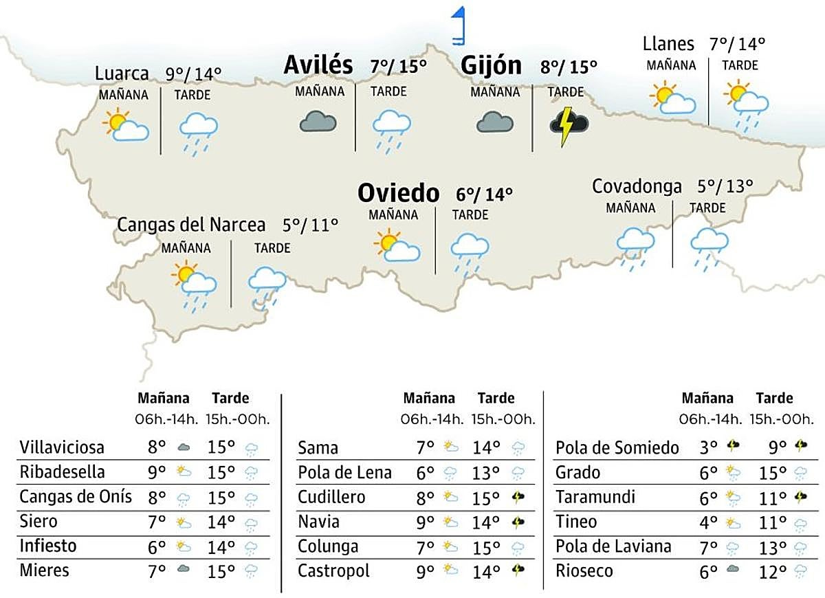 El miércoles va ser un día airosu con nubosidá variable y una mayor probabilidá de precipitaciones nuevamente nel oeste y sur del Principáu, ensin refugar que pueda escapase dalgún bastiu nel restu mientres la primer metá del día. La cota de nieve va xubir hasta los 1400 o 1500 metros d’altor. Les temperatures van xubir nel casu de les máximes y van caltenese nel de les mínimes.