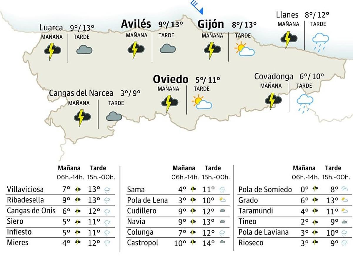 Vamos amanecer con cielos bien nublos y precipitaciones que van dexar nevaes a partir de los 600 metros. Hasta les 12 hores del mediudía va tar activáu l’avisu naranxa nel cordal y el mariellu nel suroccidente por nevaes significatives. Mientres la segunda parte del día vamos reparar como les precipitaciones van tender a unviar y la nubosidad va dir siendo cada vez menos compacta. Ello ye que van acabase abriendo grandes claros a la fin de la tarde y primeres hores del anochar. Los vientos van soplar de noroeste moderaos con delles raches daqué más significatives nel cordal. Estos vientos van dir abocanando hasta’l puntu d’acabar siendo fluexos y variables a la fin del día.