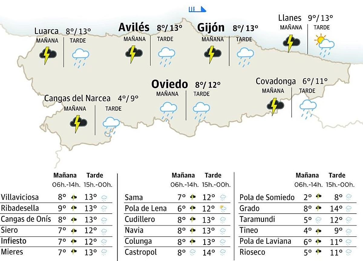 Esti xueves entá se preven raches fuertes de primeres pero, col intre de la xornada, los vientos van dir abocanando. En cuanto al estáu de los cielos, prevese abondosu nubosidá de primeres con precipitaciones que podríen afectar a cualquier puntu, pero van dir unviando a lo llargo de la tarde. Ello ye que el día va acabar con cielos poco nublos. La cota de nieve va tar en redol a los 700 o 800 metros a primer hora de la mañana, con enclín a xubir hasta los 1100 metros a mediudía.
