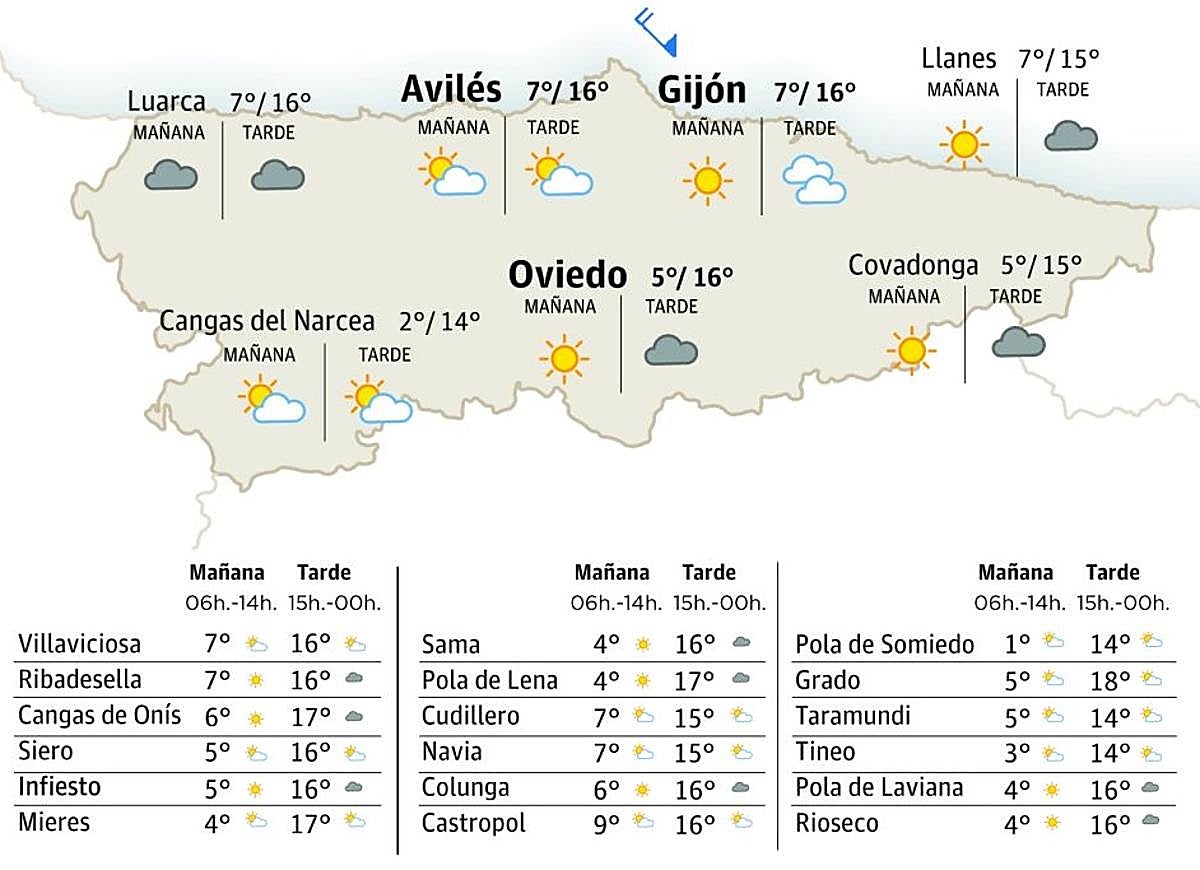 Vamos tener pela mañana dellos intervalos de nubes altes ensin importancia con enclín a abrir grandes claros col pasu de les hores. Poro, el sol va cobrar protagonismu y les agües van ser totalmente inesistentes. Amás, los vientos van ser fluexos y variables polo que nada va tener que ver el día d’esti vienres (y los siguientes) con situaciones vivíes estes últimes selmanes. Les temperatures máximes van xubir en tol Principáu. Concretamente, hasta 4 o 5 ºC na metá sur y hasta 3 o 4 ºC nel norte. Les mínimes van baxar na zona central asturiana y van caltenese ensin cambeos nel restu respecto añl xueves.
