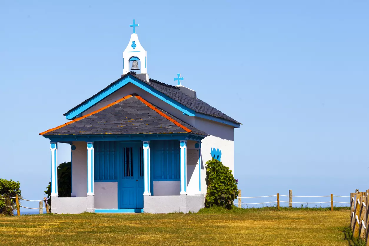 Viajar / La ermita más guapa d’España ta a lo cimero d’un cantil: nun pueblu exemplar d’Asturies, de madera azul y blanca y abrazada pol Atlánticu. Tan guapa y fotoxénica que paez una postal.