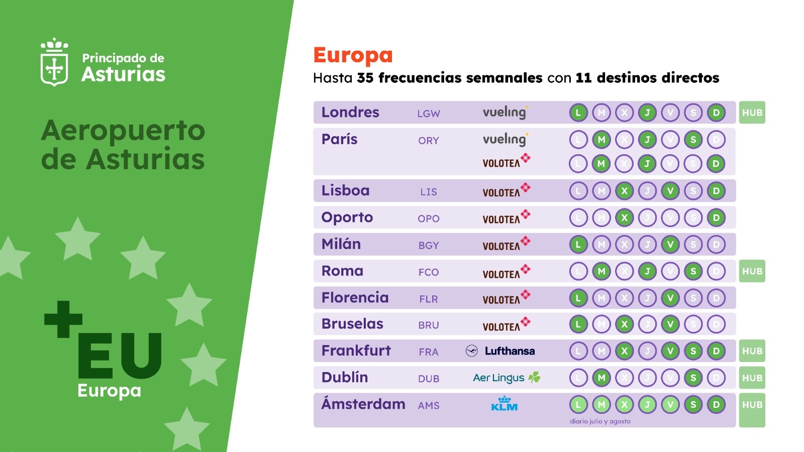✈️ El Principáu estrena la temporada aérea de branu con 30 destinos directos y una ufierta récord de 1,6 millones de places. La Estratexa de Conectividad Aérea incorpora Porto, Florencia y Dublín a la parrilla internacional y capta dos nueves aerollínees: Aer Lingus y KLM. Ta previstu que l’aeropuertu de Santiago del Monte rexistre hasta 372 vuelos per selmana nos momentos de mayor actividá.