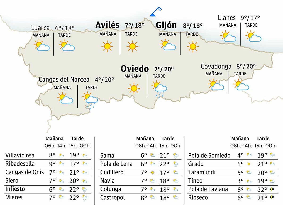 Esperamos una xornada estable en tol Principáu. Los cielos van tar asoleyaos dende primer hora de la mañana. Nun va haber posibilidá dalguna de precipitaciones y, a lo sumo, podría reparase dalguna nube baxa en dalgún momentu en zones costeres del occidente principalmente. Los vientos van empezar de sur, sobremanera nel cordal, pero dirán afitándose de componente este a lo llargo del día. Les temperatures máximes van xubir hasta 4 ºC nel cordal y nel suroccidente, y hasta 2 o 3 ºC nel restu de la metá sur asturiana. Na metá norte nun s’esperen cambeos respecto al llunes salvu na mariña central onde, llixeramente, van ser un pocu más baxes. Les mínimes van baxar hasta 2 ºC. Poro, van ser unes temperatures relativamente prestoses con máximes d’hasta 18 o 19 ºC nes primeres hores de la tarde.