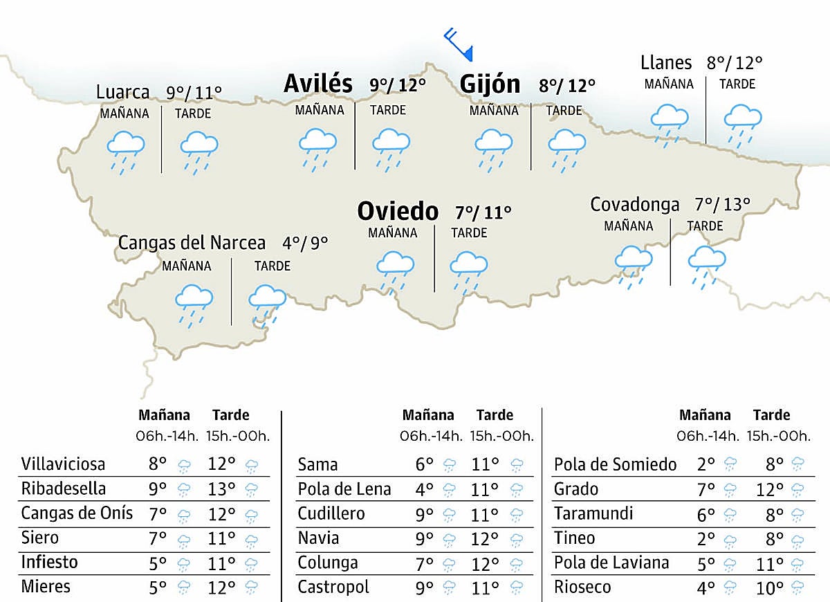 Esperamos cielos nublos con precipitaciones qu’entá van ser significatives mientres la mañana. A lo llargo de la tarde, anque nun se refuguen entá agües débiles, van tender a unviar sobremanera nel tramu final del día. Ello ye que nun se refuga l’apertura de delles escamplaes antes de concluyir la xornada. La cota de nieve va empezar sobre los 1000 metros y va dir xubiendo progresivamente hasta los 1400 metros. Hasta les 10:00 hores de la mañana va tar activáu entá l’avisu mariellu nel cordal por nevaes a partir de los 1000 metros d’altor.