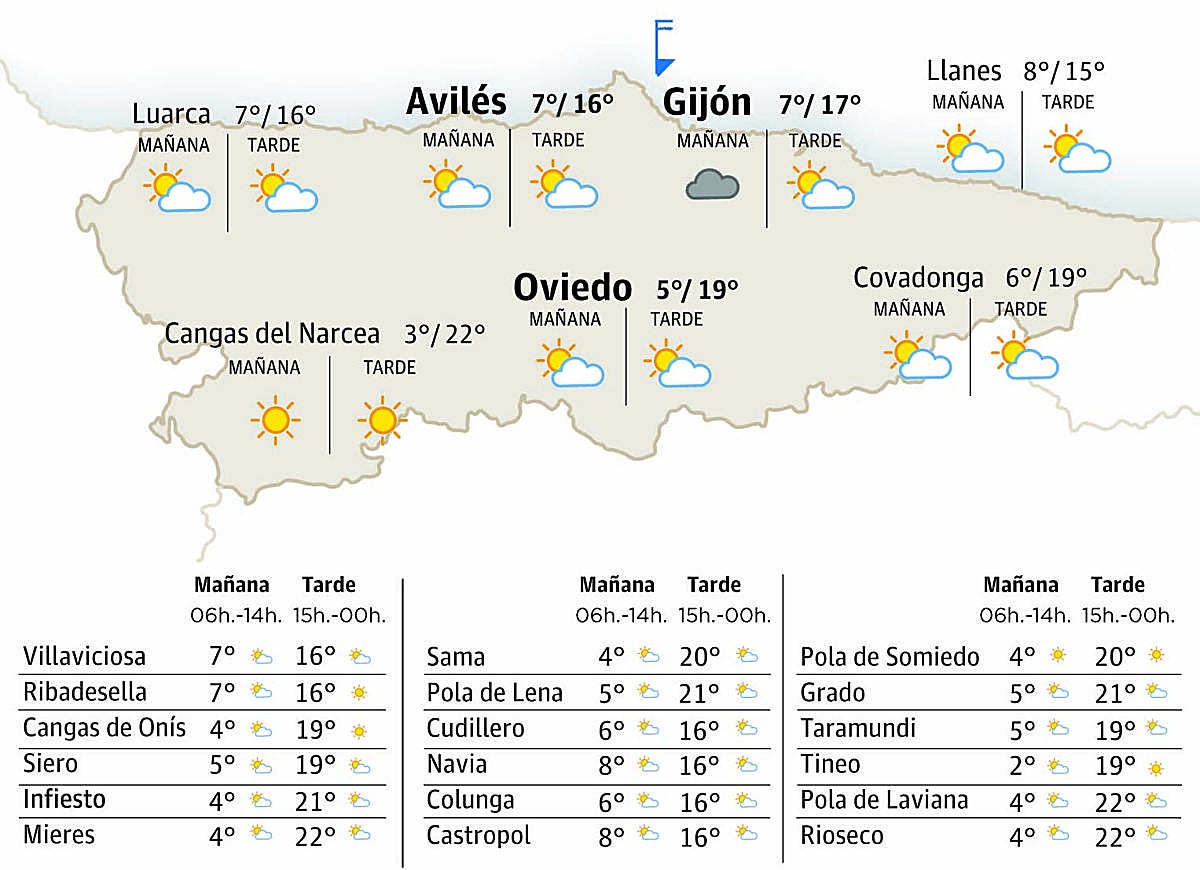 Esperamos una xornada na que, anque vamos poder amanecer con dellos intervalos de nubes altes, conforme meyora la mañana los cielos dirán llimpiándose de nubes y el sol va ser l’únicu protagonista. Les temperatures van xubir sobremanera nel interior. Les máximes van xubir hasta 5 o 6 ºC especialmente na metá sur asturiana. Tamién va ser significativu l’ascensu nel restu del interior y, de forma más moderada o llixera na mariña. Les mínimes van esperimentar un llixeru descensu. Los vientos van ser fluexos polo xeneral.