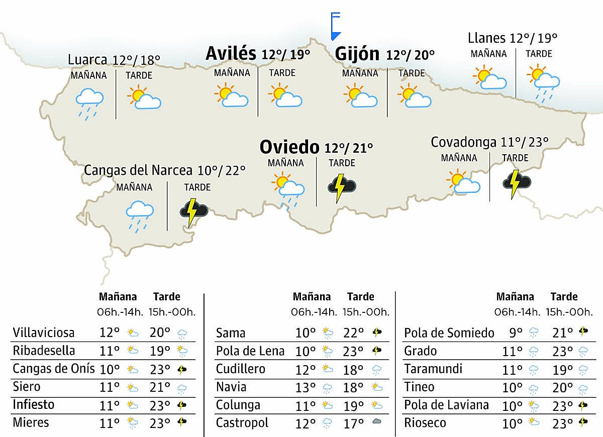 Esperamos intervalos nublos mientres el día. Prevese estabilidá mientres gran parte de la xornada, pero a lo llargo de la tarde nun se refuga un aumentu de nubosidad nel cordal y nel suroccidente que podría acabar dexando bastios d’orixe tormentosu nestos sectores, sobremanera na recta final. Precisamente nel suroeste y na cordal caltendrán les temperatures máximes al respective de les anotaes el martes, pero nel restu espera un descensu d’hasta 4 ºC. Les mínimes, pela so parte, tamién van baxar y van facer sobremanera na zona central del Principáu.