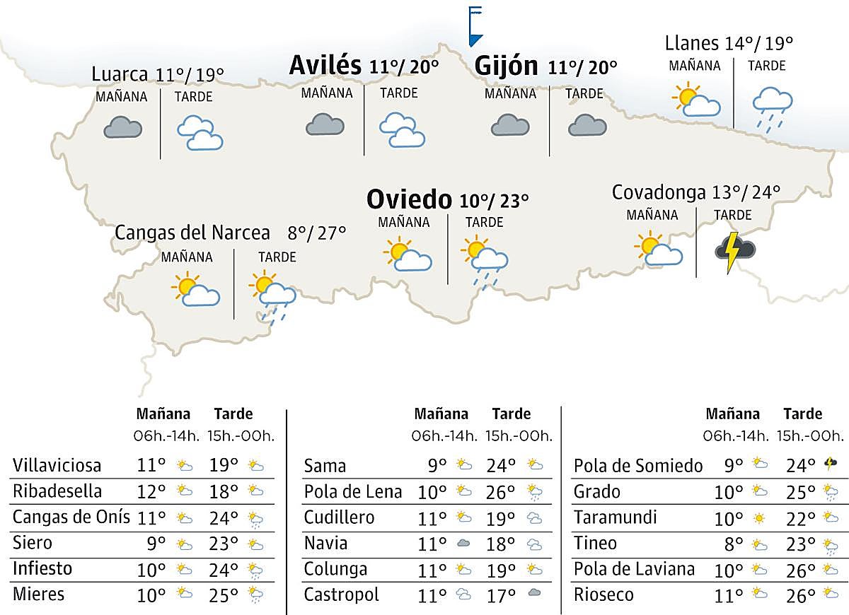 Los cielos van tar pocu nublos polo xeneral sacantes nubes baxes que podríen tar presentes na mariña y zones próximes. A lo llargo de la tarde nun se refuga l’apaición de nubes de tipu altu dende’l cordal y, anque va ser difícil, podría escapase dalguna gota nel sur de la rexón en momentos puntuales. Los vientos van ser fluexos en llínees xenerales.
