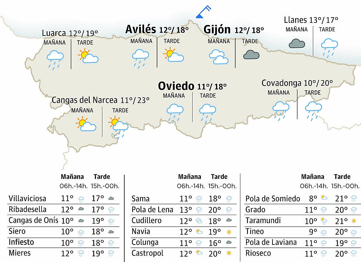El vienres prevese más nubosidá, con posibilidá de bastios tantu de madrugada como a partir de la tarde. Estos bastios podríen venir acompañaos de delles nubes, sobremanera nel cordal y zones del terciu sur asturianu. Los vientos van ser variables, pudiendo predominar d’oeste na mariña. Les temperatures van baxar nel casu de les máximes y van xubir nel de les mínimes.