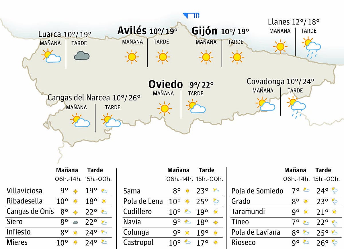 Esperamos una xornada nubosa en tol Principáu. Estes nubes van dexar bastios que van ser más probables na metá sur asturiana, pero nun se refuga que puedan estendese a otros puntos de la rexón. Amás, podríen venir acompañaos de nube. Nel tramu final del día prevese que s’abrirán escamplaes nel cielu. Tocantes a los vientos, van ser fluexos y variables, anque predominando d’oeste na mariña y con dalguna qu’otra racha moderada. Les temperatures máximes van baxar hasta 5 o 6 ºC nel cordal, hasta 3 o 4 ºC nel restu del interior, y de forma más llixera na mariña y zones próximes. Les temperatures mínimes van xubir nel centru y nel oriente, y van caltenese ensin cambeos nel sector occidental.