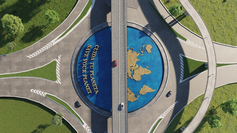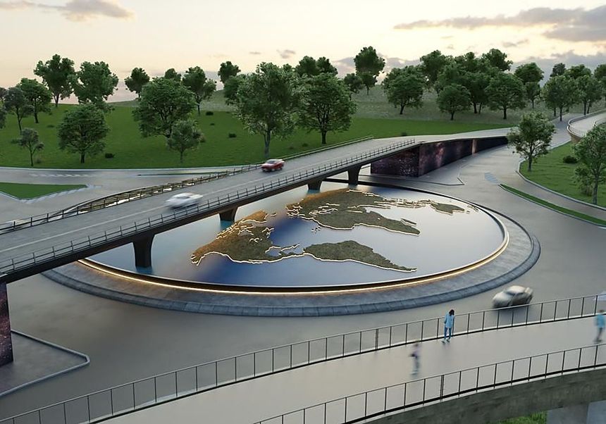 Va ser visible dende la pasarela ente Llugones y La Fresneda, y va dir acompañáu pol lema «Save the Planet». El proyectu en marcha escuerre tresformar la rotonda nuna llomba semiesférica que representa los océanos, sobro la que se van asitiar los continentes, fechos de pieces metáliques tipo chapa, pintaes con colores terrosos.