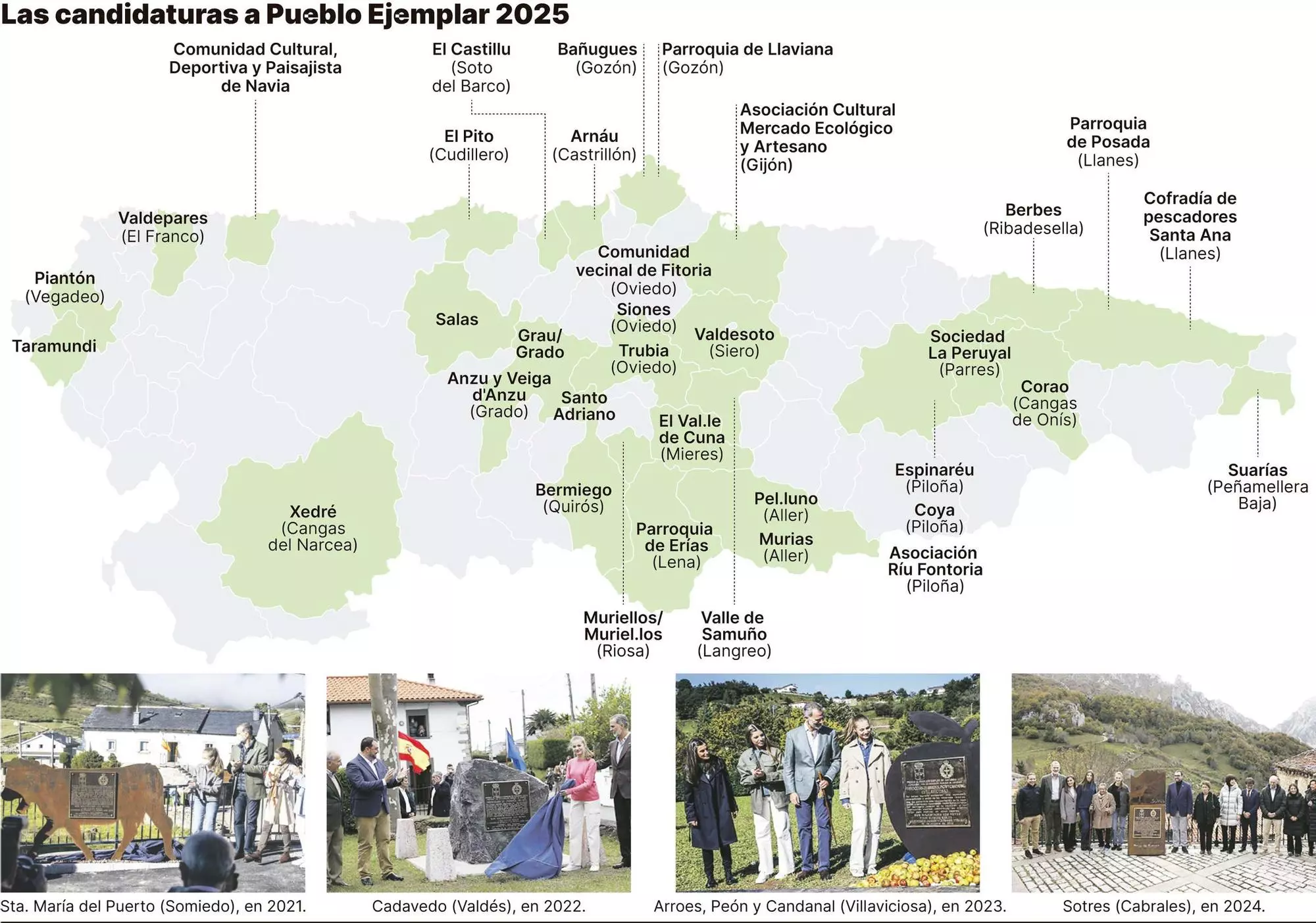 Esti martes conocerá’l nome de galardonáu ente les 34 candidatures presentaes. Queden solo dos díes pa saber cuál va ser el Pueblu Exemplar d’Asturies de 2025, y los 34 candidatos preparar con nervios ya ilusión pos esta reconocencia convirtióse nun símbolu d’arguyu ya identidá pa los pueblos del Principáu. FPA / Candidatures / El Comercio