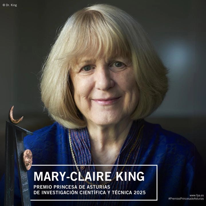 La xenetista estadounidense Mary-Claire King, reconocida por haber identificáu los xenes que causen dellos tipos de cáncer de mama y ovariu hereditarios y por demostrar que los humanos y los chimpancés son genéticamente idénticos nun 99 per cientu, foi galardonada esti xueves col Premiu Princesa d’Asturies d’Investigación Científica y Técnica 2025. RTPA