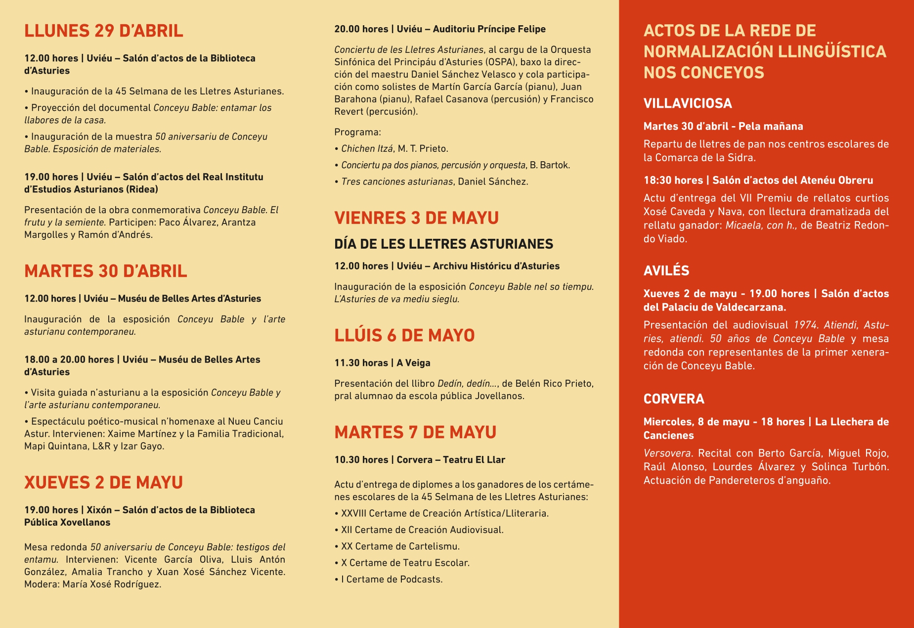 - 🗓️ La Selmana de les Lletres Asturianes ye l’actu cultural más importante del añu pa la promoción de les llingües y la cultura d’Asturies. Descarga equí’l programa d’actos de la 46 Selmana de les Lletres Asturianes.