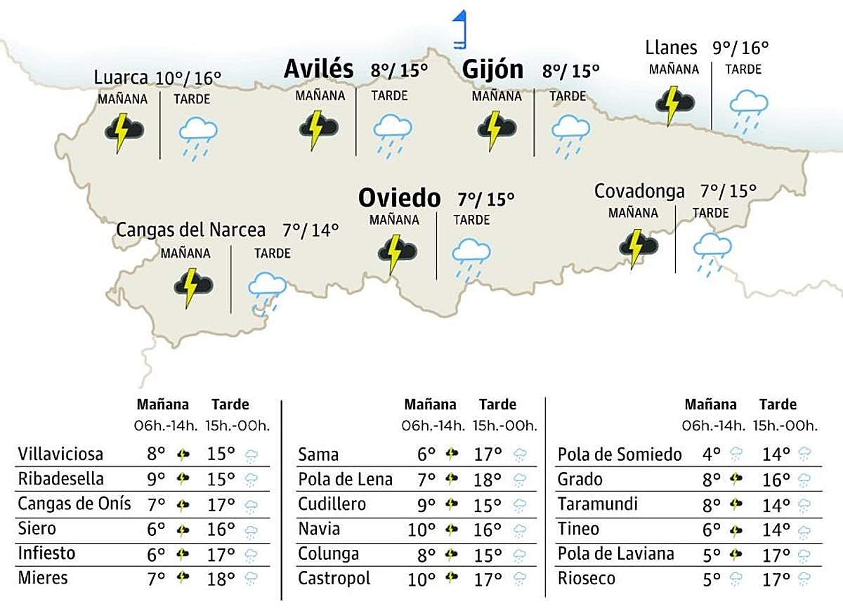 Vamos tener pela mañana dellos intervalos de nubes altes ensin importancia con enclín a abrir grandes claros col pasu de les hores. Poro, el sol va cobrar protagonismu y les agües van ser totalmente inesistentes. Amás, los vientos van ser fluexos y variables polo que nada va tener que ver el día d’esti vienres (y los siguientes) con situaciones vivíes estes últimes selmanes. Les temperatures máximes van xubir en tol Principáu. Concretamente, hasta 4 o 5 ºC na metá sur y hasta 3 o 4 ºC nel norte. Les mínimes van baxar na zona central asturiana y van caltenese ensin cambeos nel restu respecto añl xueves.