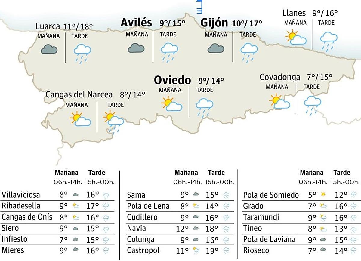 Vamos amanecer con nubes na mariña y cielos más estenos nel restu. Asina tou, vamos reparar como a lo llargo del día esta nubosidad dirá estendiéndose por tola rexón. Les precipitaciones van ser pocu probables pero nun se refuguen, sía que non, orbayos na mariña y, de forma más esvalixada, n’otros puntos de la metá norte asturiana. Los vientos van ser fluexos y variables, pudiendo predominar de nordés na mariña con dalguna qu’otra racha moderada. Les temperatures máximes van baxar ente 1 y 2 ºC respectu al llunes en tol Principáu salvu nel terciu sur onde se van caltener ensin cambeos. Les mínimes apenes van variar con, a lo sumo, dellos ascensos bien llixeros y locales.