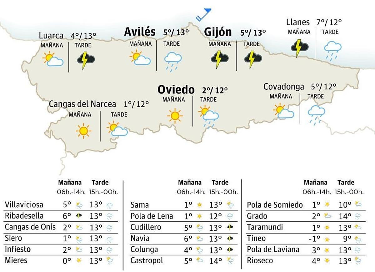 Entá se preven raches localmente fuertes de vientu de componente sur mientres la mañana y, a lo sumo, primeres hores de la tarde. Les zones altes del oeste y el cordal van ser los sectores onde más se vean afectaos por esos vientos. Ello ye que l’Axencia Estatal de Meteoroloxía va tener activáu hasta’l mediudía l’avisu mariellu nel cordal por raches d’hasta 90 km/h. Nel restu de la rexón les raches van ser moderaes a lo sumo. Conforme meyora la tarde vamos reparar como la intensidá va dir a menos hasta acabar siendo fluexos. En cuanto al estáu de los cielos, vamos tener más nubosidá escontra’l cordal y otres zones del terciu sur onde les precipitaciones van ser más probables y frecuentes con nieve a partir de los 1700 o 1800 metros.
