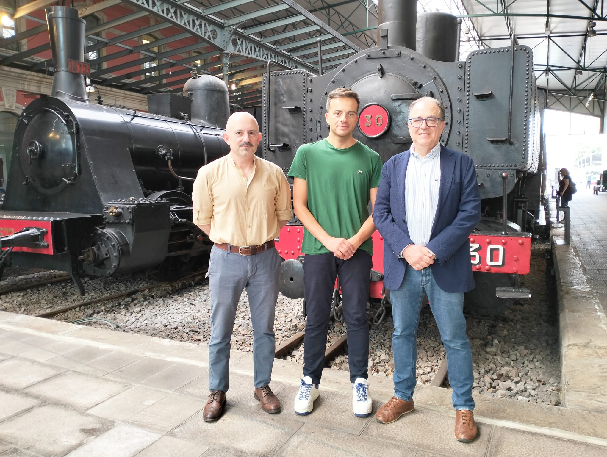 Los directores xenerales d’Axenda 2030 y Consumu, Juan Ponte (centru) y Faustino Zapico (izquierda), visiten el Muséu del Ferrocarril. A la derecha el director del Muséu Javier Fernández.