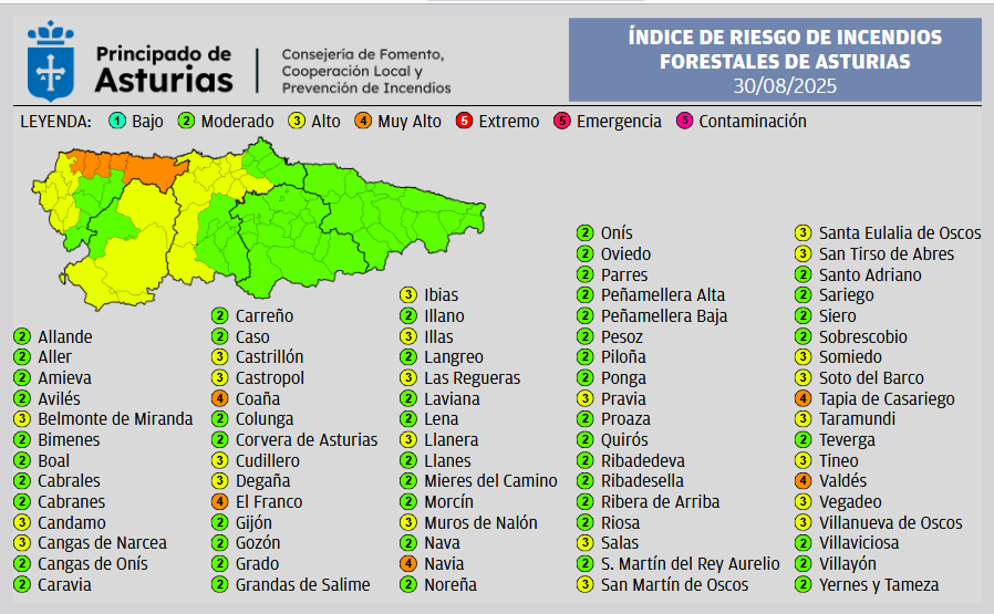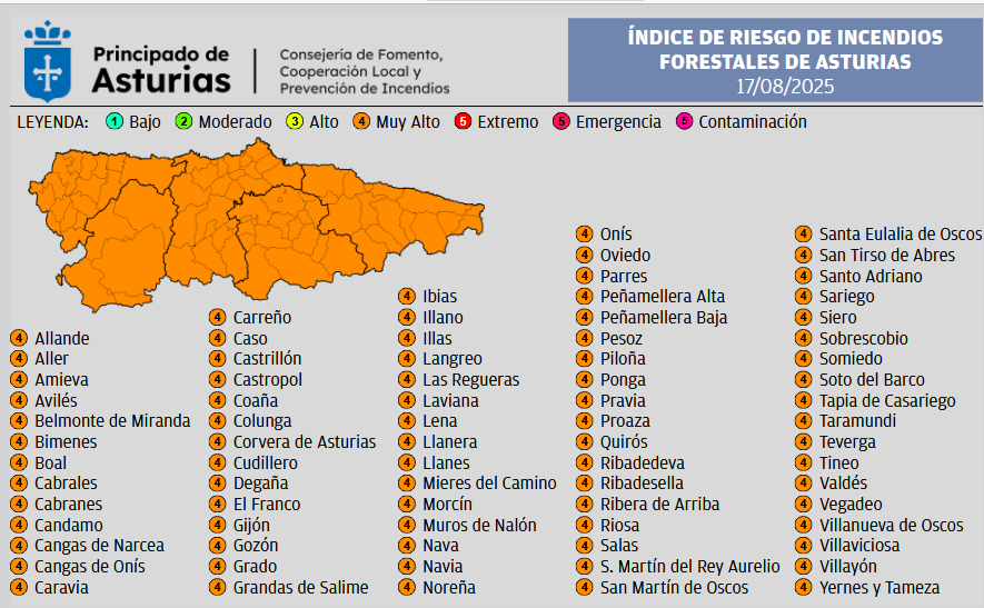 ⚠️Índiz de Riesgu de Quemes Forestales d’Asturies domingu 17 d’agostu. ⛔️🔥 Prohibíes toles quemes.