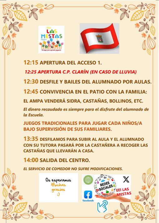 – Recordar que las AMPAS – CP Clarín y la EEI Las Mestas – os invitan a asistir a la Fiesta que celebrarán en horario de tarde, ese mismo día, de 18:30 a 20:30 h