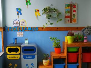 Este curso tenemos un pequeño taller en un vestíbulo del cole con el lema CUIDEMOS NUESTRO PLANETA ,donde una gran globo terráqueo nos recuerda que compartimos este maravilloso planeta tierra con muchos animales y plantas.Además tenemos alguna planta que debemos cuidar y un rincón de reciclaje, con contenedores de papel y plástico y lo que más les gusta a los niños, unos chalecos para que la patrulla del reciclaje pase por las aulas a recoger el papel y el cartón para reciclar. Esta actividad es la que más les divierte.Los chalecos tienen una gran R para recordar la importancia de RECICLAR, REDUCIR, REUTILIZAR Y RECOGER la basura.