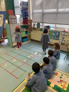 un niño/a tendrá la tarjeta de la figura geométrica y otro/a niño/a tendrá la