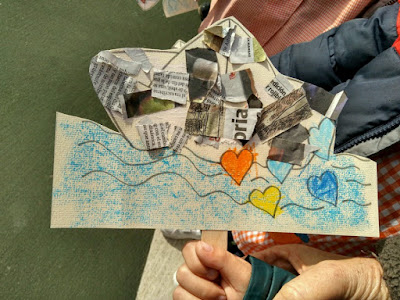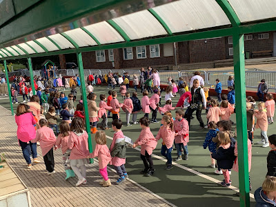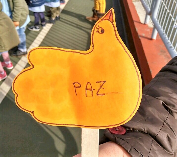 Aunque el tiempo no nos acompañó mucho, nada impidió que saliésemos al patio del Centro, cada aula con un distintivo alusivo al Día de la Paz. Cada nivel cantó una canción relativa a dicha temática y por último, todos/as juntos/as interpretamos una canción en inglés.