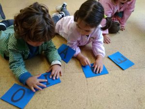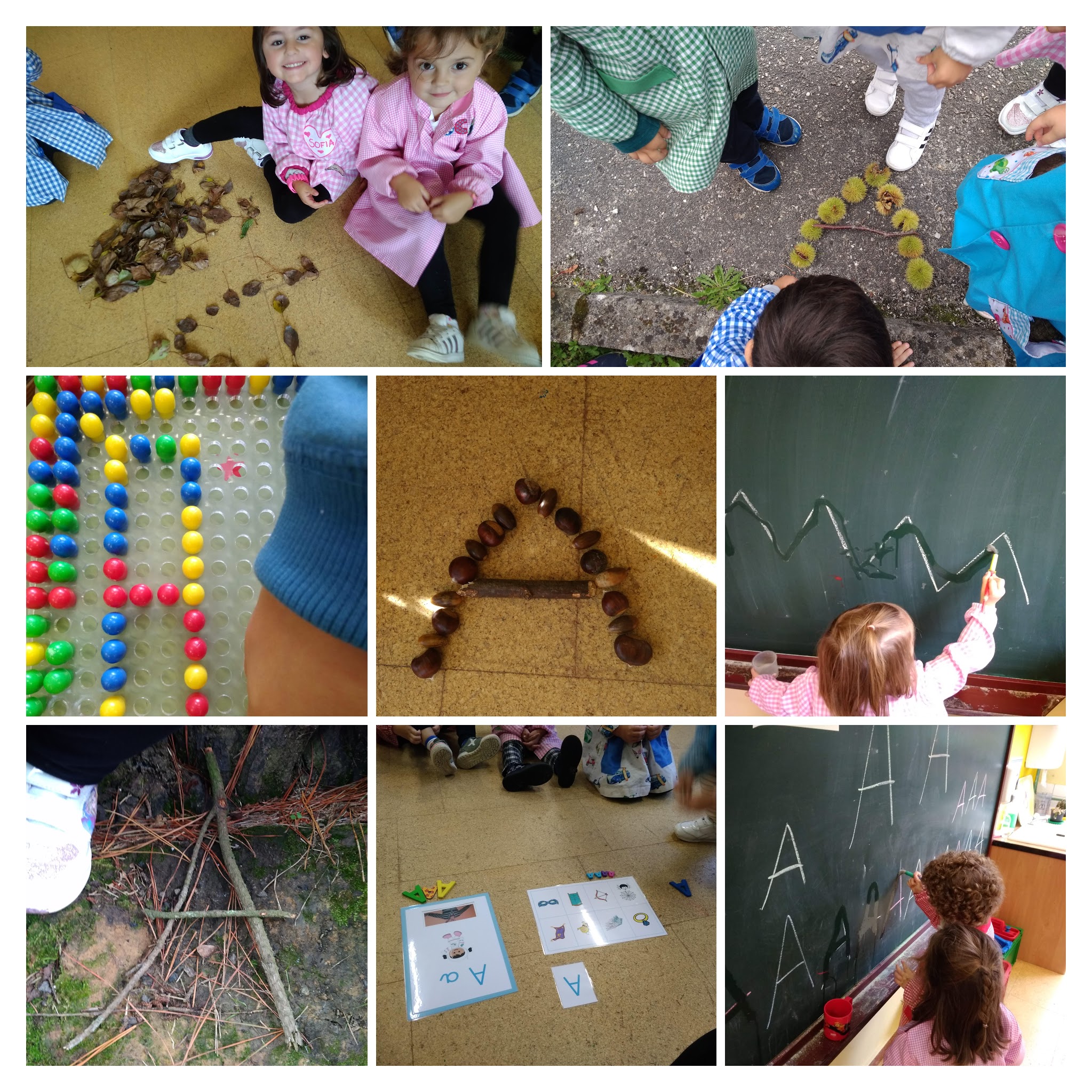 Con hojas, palos u «oricios» de La Viesquina, con pinchitos o borrando con pincel la tiza en la pizarra, la A se puede hacer de muchas maneras.