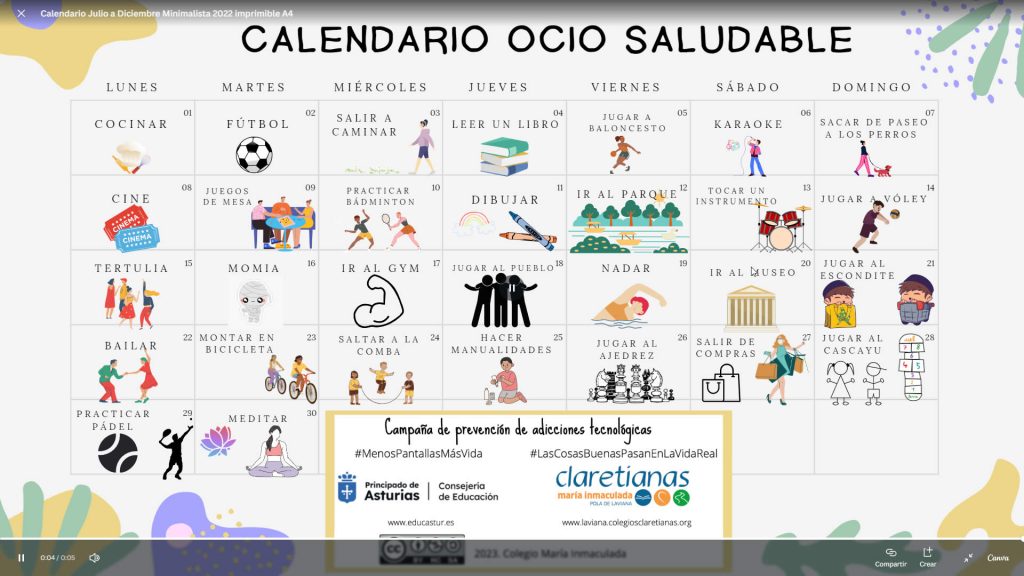 Infografía: Calendario Ocio saludable (Canva) – Vídeo: Calendario Ocio saludable (Canva)