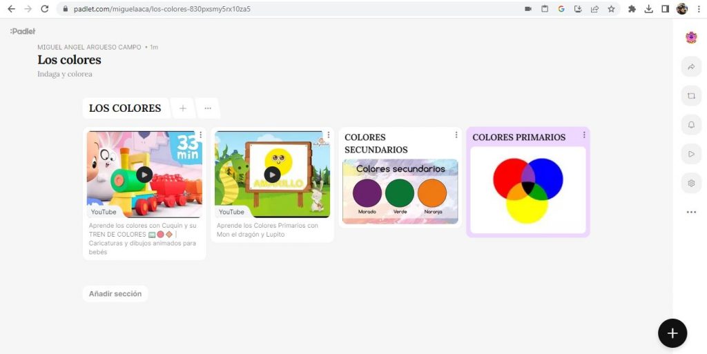 En esta nueva entrada vamos a presentar un material con el que hacer una primera explicación e indagación en los colores. Serán vistos tanto primarios como secundarios. El recursos digital ha sido el padlet, uno de los que más utilice durante la pandemia y que a posterior me ha seguido sirviendo de gran utilidad.