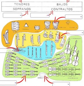 Cuando el coro de voces actúa con la orquesta, este se sitúa detrás y siguiendo, igualmente, un orden en la colocación de las voces. Con la siguiente actividad lo verás claro.