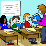 «Dibujo animado de un grupo de alumnos leyendo y una profesora corrigiendo en una clase»