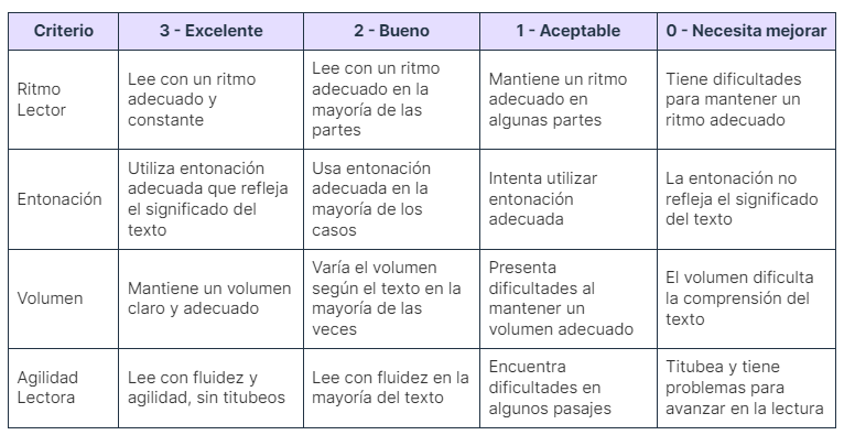 «Escribe una rúbrica de evaluación para poder evaluar el ritmo, la entonación, el volumen y la agilidad lectora»