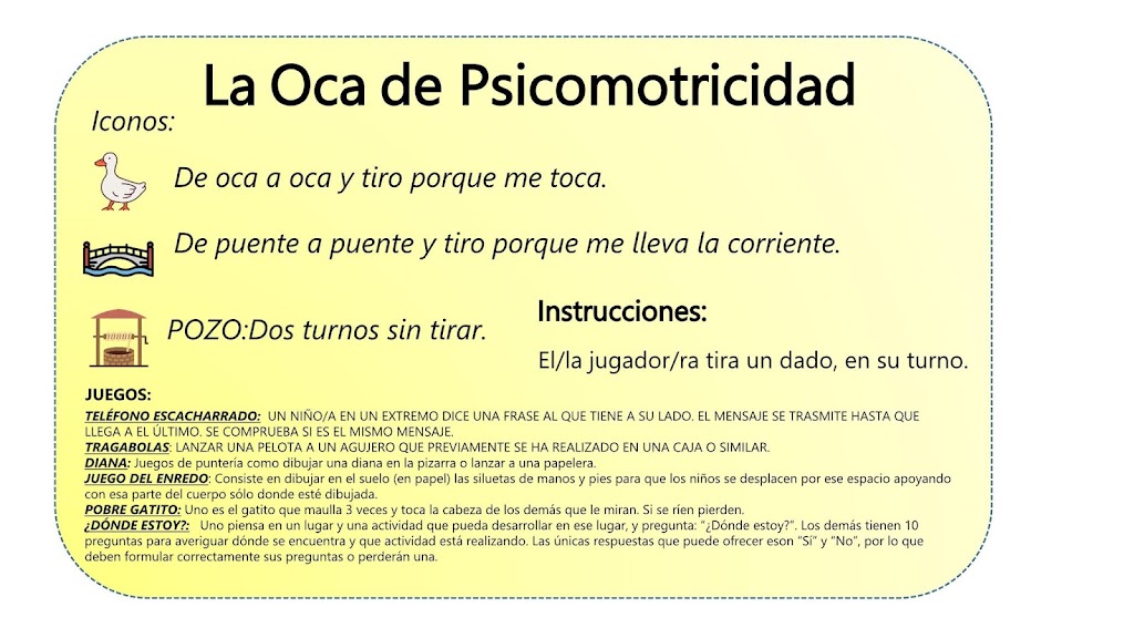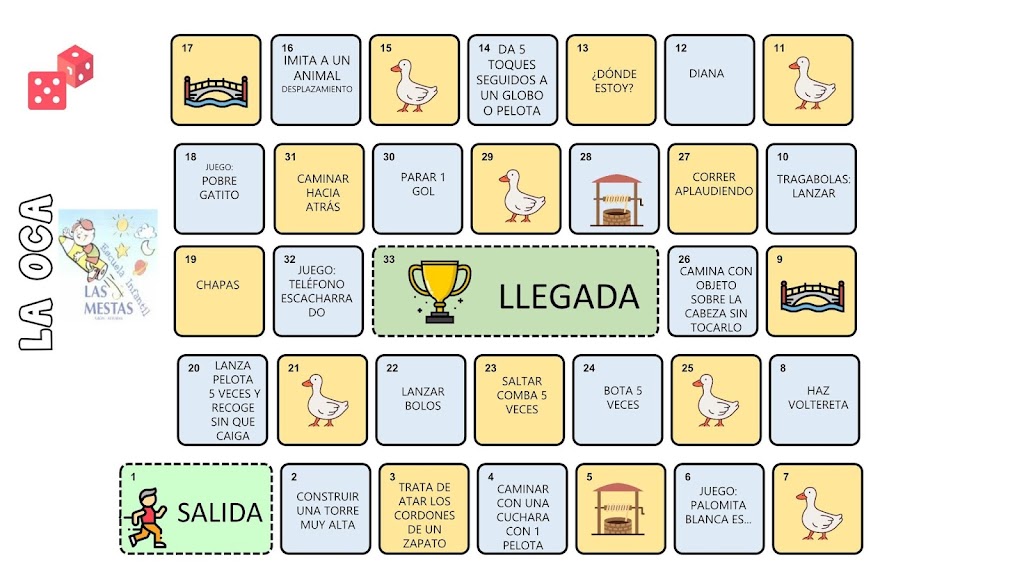 El juego de la oca es un juego de mesa para dos o más jugadores. Cada jugador tira un dado y avanza su ficha por un tablero en forma de espiral. Dependiendo de la casilla en la que se caiga, se puede avanzar o por el contrario retroceder.