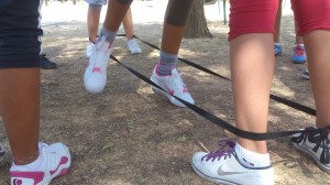 *En este juego las personas que sujetan la goma lo hacen con las manos. Tienen que hacer una cruz en medio con la goma, y cada vez que cantan la canción van pisando la goma, subiéndola o bajándola, colocándola a modo de telaraña por la que los que saltan tendrán que ir pasando de uno en uno sin tocar la goma en ningún momento (ni tampoco a las dos personas que la sujetan), pueden saltar, arrastrarse… lo que sea pero sin tocar nunca la goma.