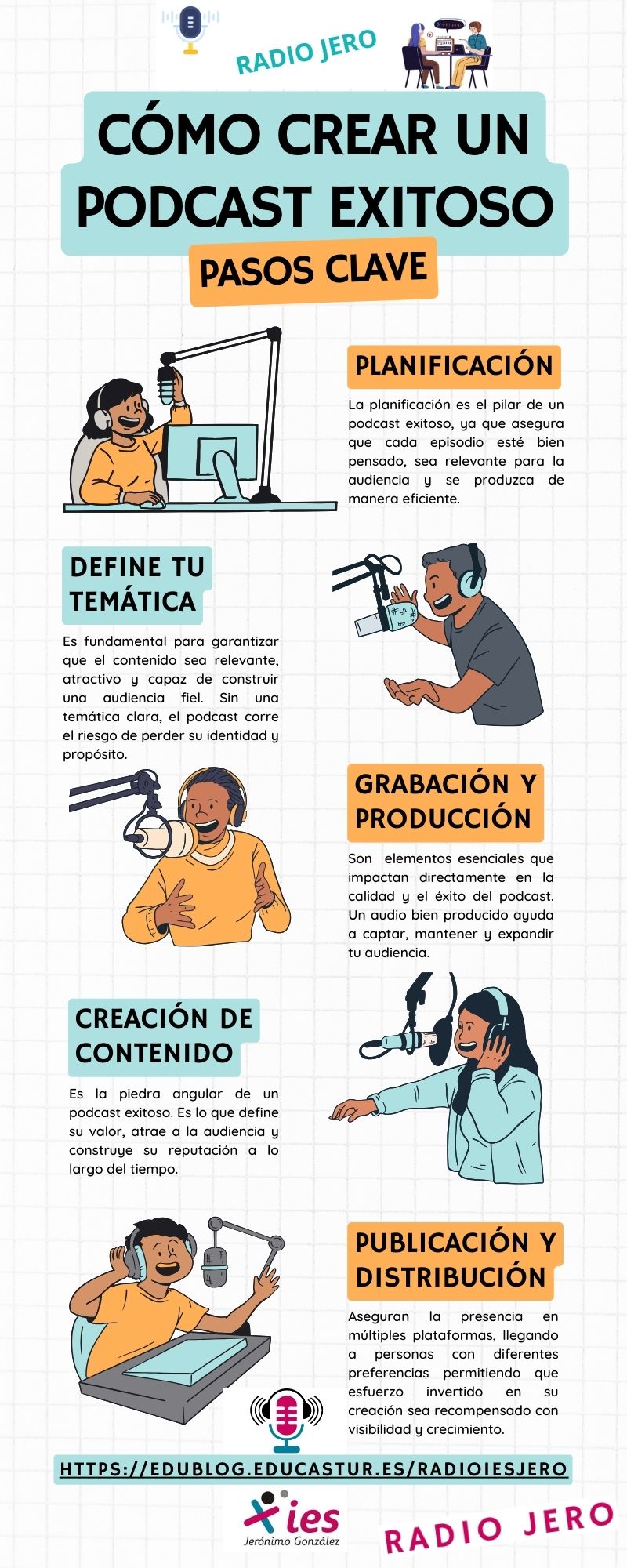 1. Elige el tema: Antes de empezar, decide sobre el tema o contenido que abordarás en tu pódcast. Puede ser un proyecto vinculado a la materia o a la unidad, un tema de interés general o de actualidad o puedes plantearlo como estrategia para trabajar la competencia comunicativa de forma transversal.
