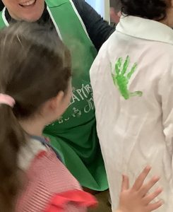De momento, seguimos preparando el carnaval. Lo estamos pasando genial preparando nuestra bata de pintor. ¡Es tan divertido mancharse las manos…!