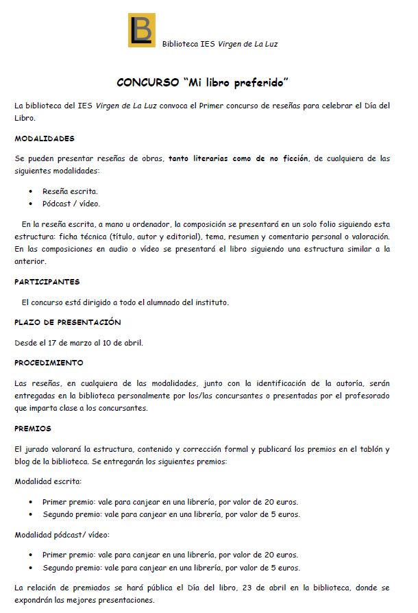Se acerca la celebración del Día del Libro y nuestra biblioteca quiere celebrarlo convocando este I Concurso de reseñas.